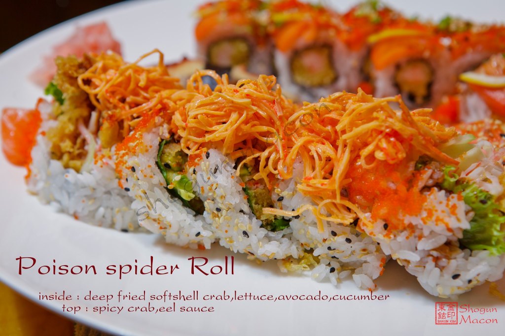 Next is probably my second favorite. The “Poison Spider” is a delightful filling roll that is very crunchy and has a great slight spicy kick to it. Inside is deep-fried softshell crab, lettuce, avocado, and cucumber. The softshell crab is very delicious and mainly my favorite thing about this roll. On top of the roll is spicy crab and eel sauce, which both complement each other nicely.