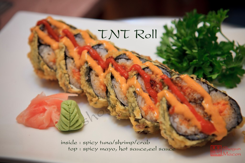 Last for this section is some people’s favorite if you love spice! The “TNT” is a spicy roll that just explodes in your mouth with flavors and a great amount of spiciness! Inside are spicy tuna, shrimp, and crab. All are separated and wrapped together to look like a block of TNT. Very cool! On top is spicy mayo, hot sauce, and eel sauce. All sauces bring a punch to your taste buds that just make the flavors dance on your tongue.